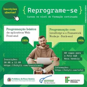 NOVA VENÉCIA: A Prefeitura de Nova Venécia, por meio da Secretaria Municipal de Educação e do Polo Universidade Aberta do Brasil (Uab), informa que as inscrições do processo seletivo para os cursos do projeto Reprograme-se, no âmbito da formação continuada, estão abertas até o dia 12 de setembro de 2022.