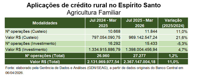 ES: O crédito rural destinado à agricultura familiar no Espírito Santo apresentou avanço no período de julho de 2025 a março de 2026, totalizando R$ 2,37 bilhões, um crescimento de 11% em relação ao mesmo intervalo anterior. Em termos absolutos, isso representa um acréscimo de aproximadamente R$ 235 milhões injetados no setor.