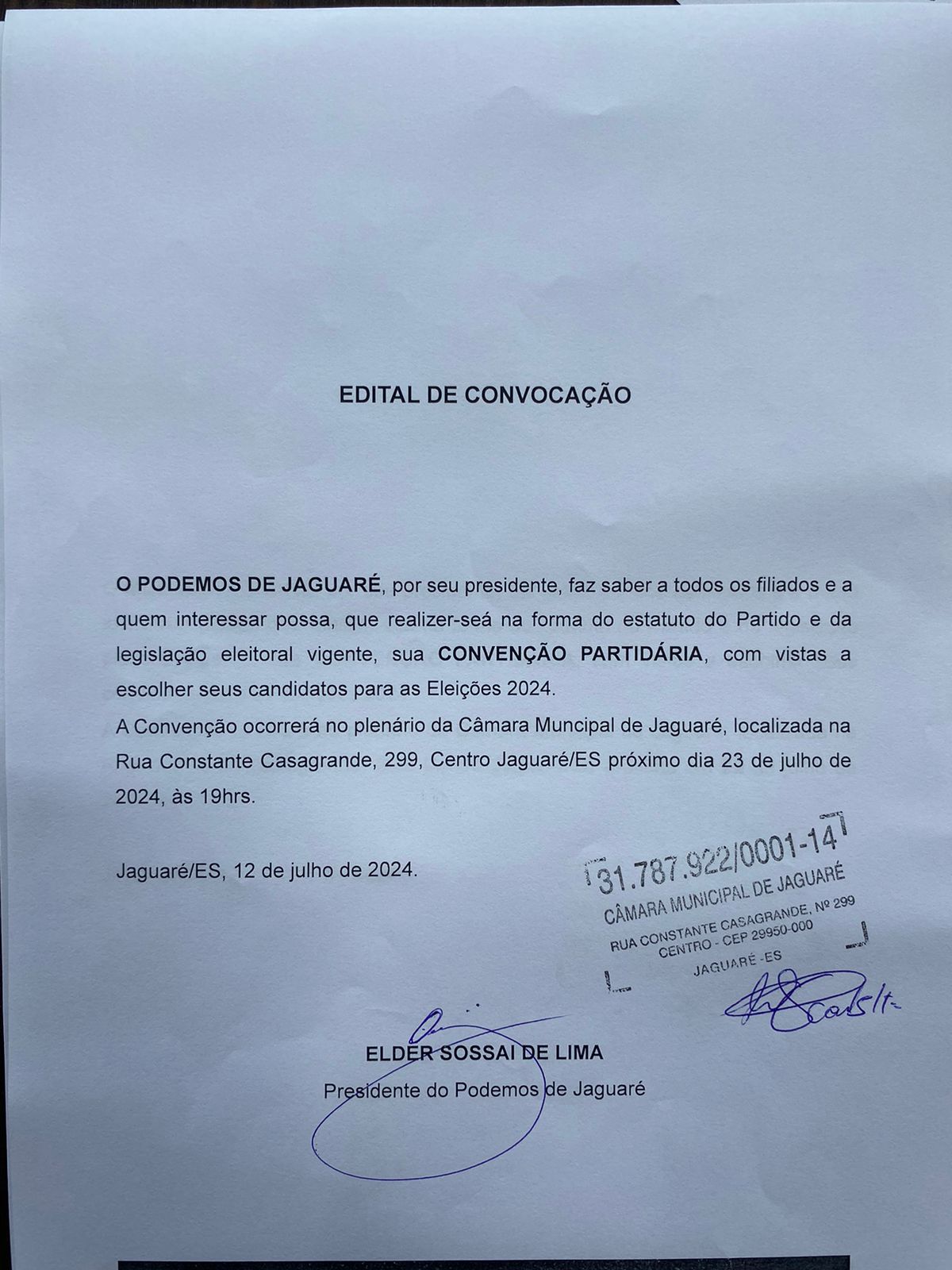 JAGUARÉ: O Podemos de Jaguaré convocou seus filiados para Convenção Partidária, em vista de escolher seus candidatos para as Eleições de 2024. A Convenção foi convocada pelo Presidente da sigla, Elder Sossai de Lima, e será realizada no dia 23 de julho, às 19h, no Plenário da Câmara de Vereadores de Jaguaré.