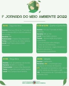 NOVA VENÉCIA: A Prefeitura de Nova Venécia por meio da Secretaria Municipal de Meio Ambiente, promoverá no dia 30/05 à 04/06 a “1ª Jornada do Meio Ambiente 2022”. A campanha abordará os cuidados ao meio ambiente através de projetos sustentáveis, conscientização sobre a importância da coleta seletiva e promoção do Ecoturismo.