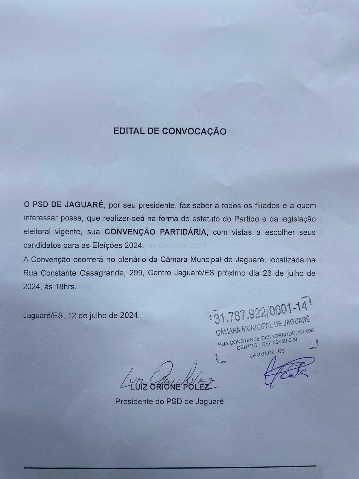 JAGUARÉ: O PSD de Jaguaré – Partido Social Democrática, convocou seus filiados para Convenção Partidária, em vista de escolher seus candidatos para as Eleições de 2024. A Convenção foi convocada pelo Presidente da sigla, Luiz Orione Polez, e será realizada no dia 23 de julho, às 18h, no Plenário da Câmara de Vereadores de Jaguaré.