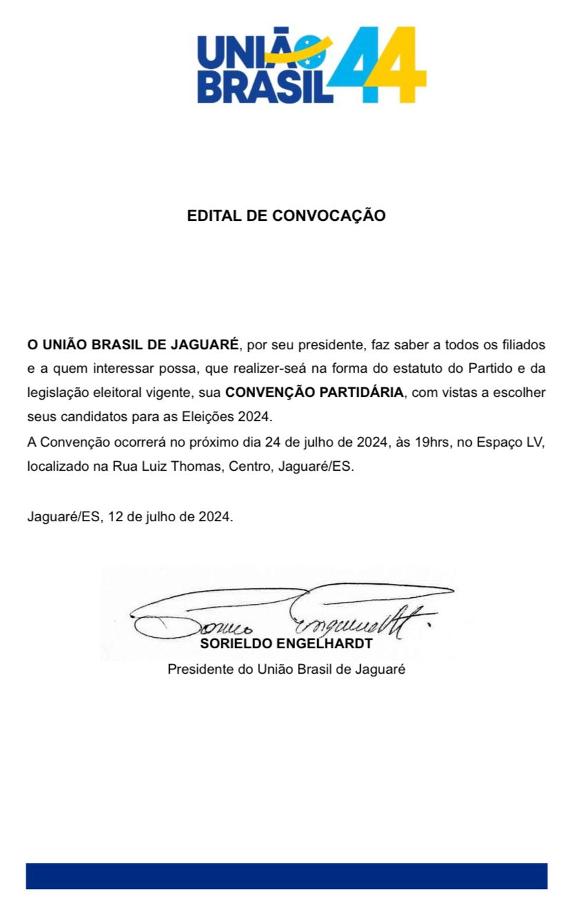 JAGUARÉ: O União Brasil de Jaguaré, convocou seus filiados para Convenção Partidária, em vista de escolher seus candidatos para as Eleições de 2024. A Convenção foi convocada pelo Presidente da sigla, Sorieldo Engelhardt, e será realizada no dia 24 de julho, às 19h, no Espaço LV, localizado a Rua Luiz Thomas, Centro, Jaguaré.